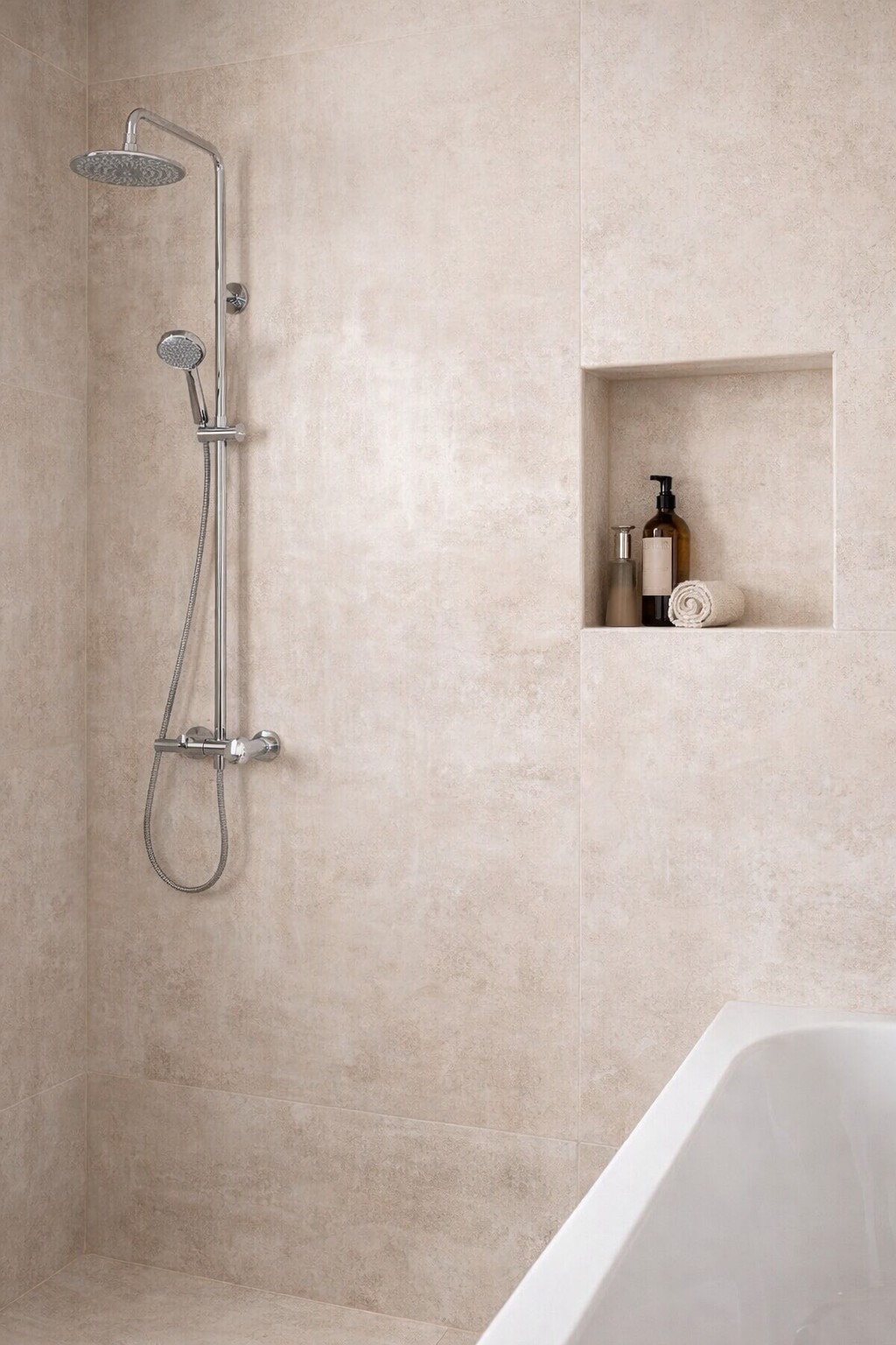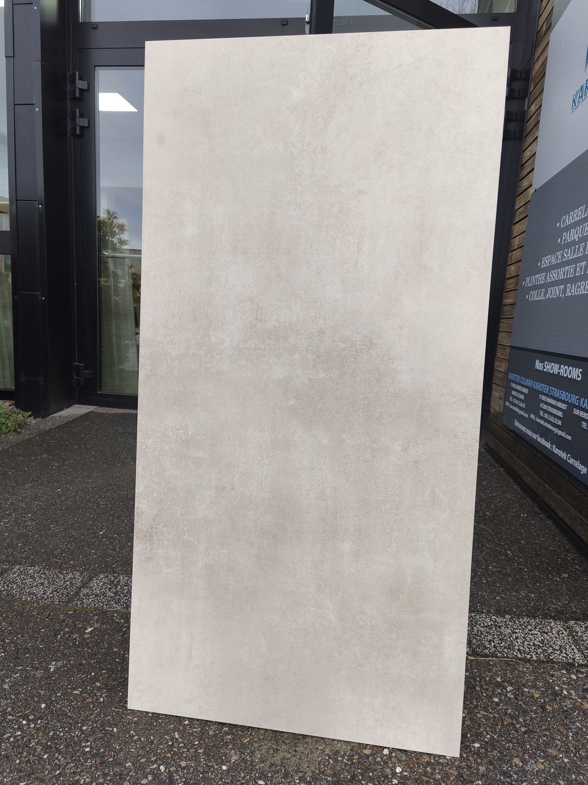 Ce carrelage grand format 60×120 cm séduit par son esthétique contemporaine et épurée. Son aspect légèrement nuancé, inspiré du béton minéral, apporte douceur et modernité à tous les espaces.