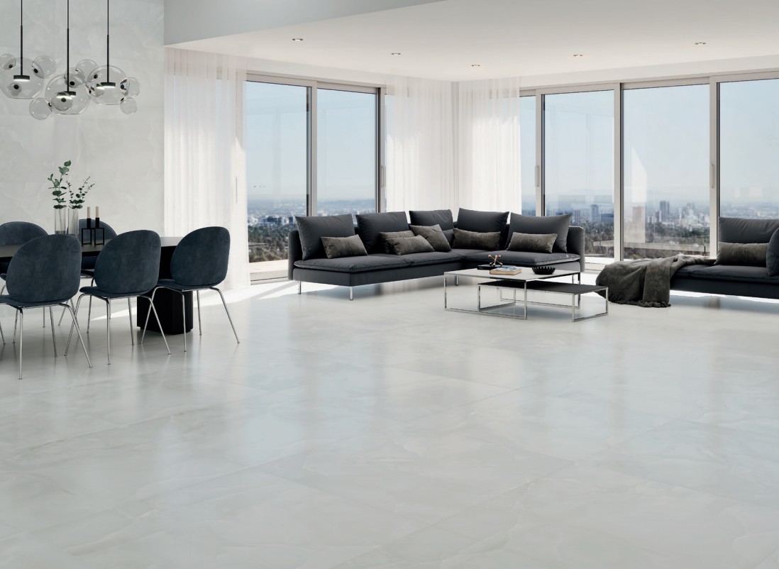 Ce carrelage grand format 100×100 cm séduit par son aspect minéral élégant et ses nuances douces et naturelles, inspirées de la pierre. Sa surface mate satinée offre un équilibre parfait entre sobriété et raffinement, apportant de la luminosité sans effet brillant excessif.