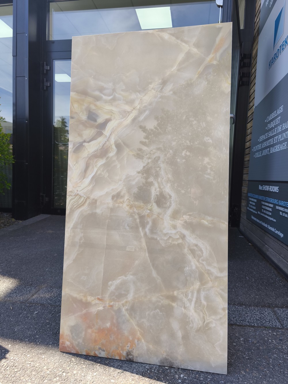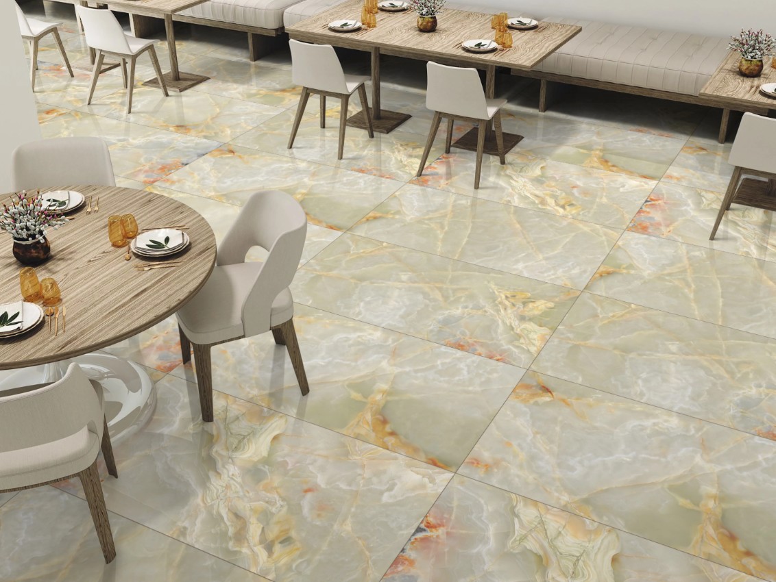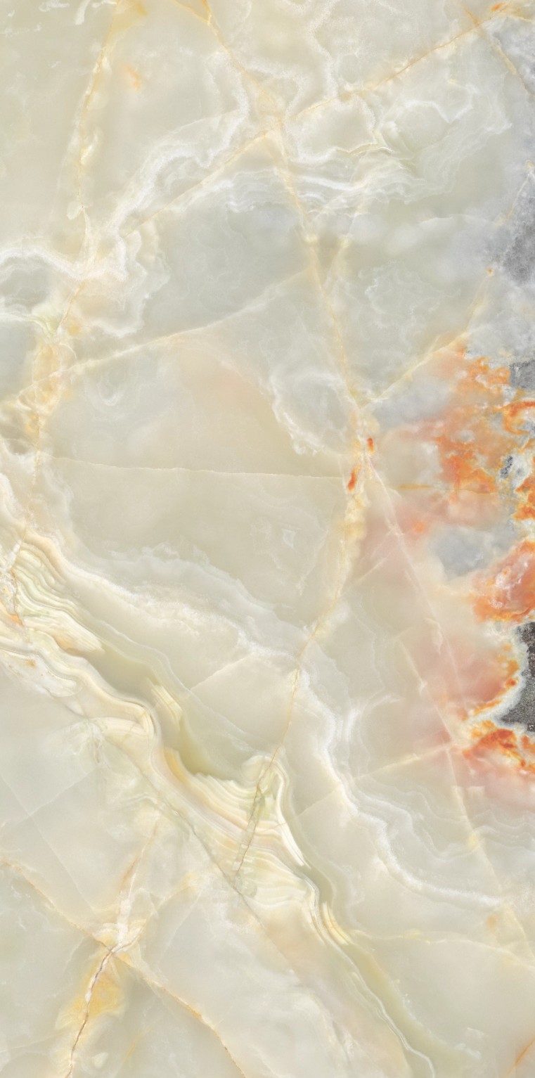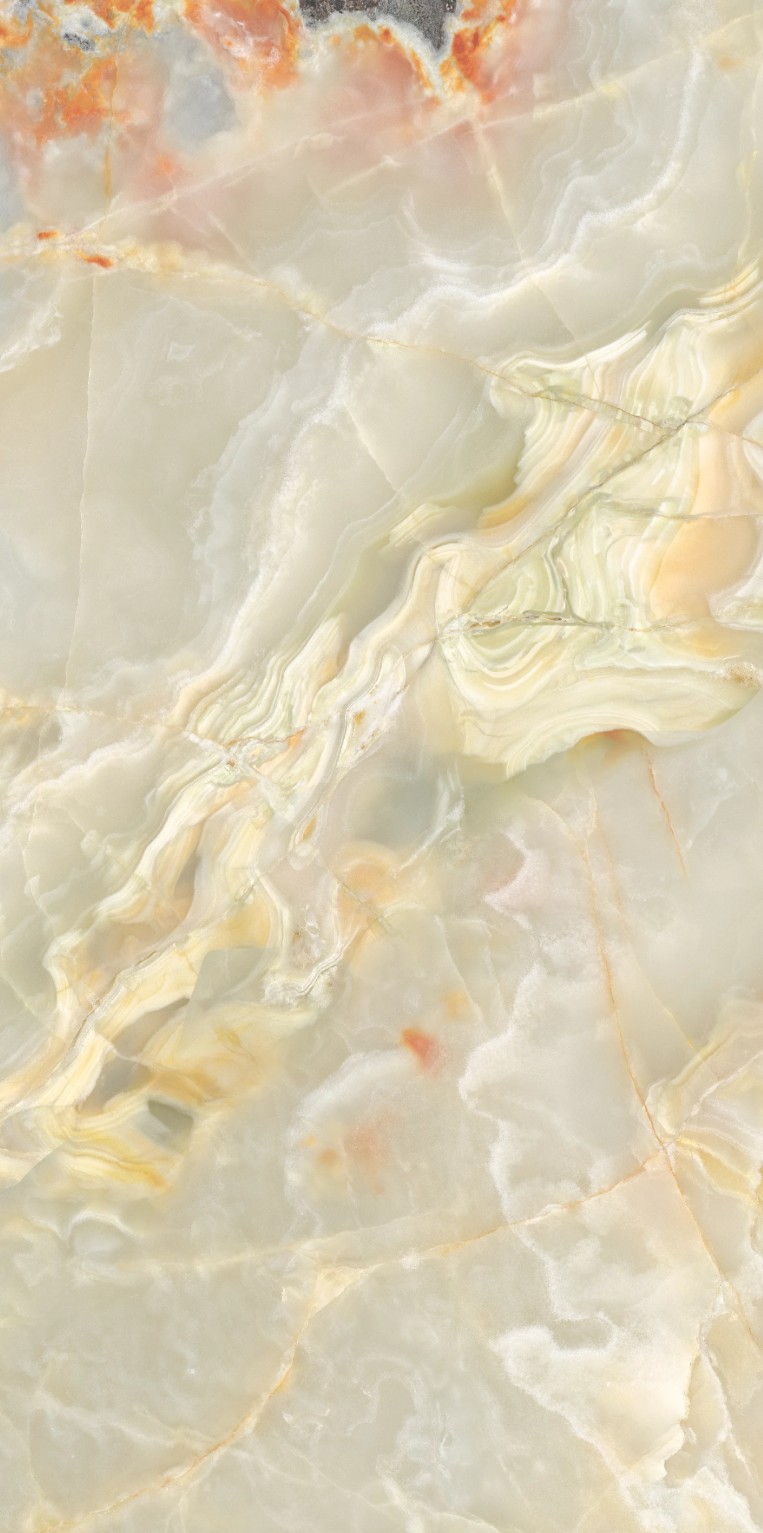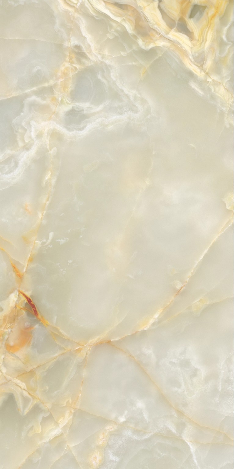 Apportez élégance et raffinement à vos espaces avec ce carrelage grand format 60×120 cm à la finition brillante. Inspiré de la pierre d’onyx naturelle, il se distingue par ses nuances délicates de vert jade, de beige crème et de légers voilages orangés, sublimés par de fines veines aux reflets dorés.