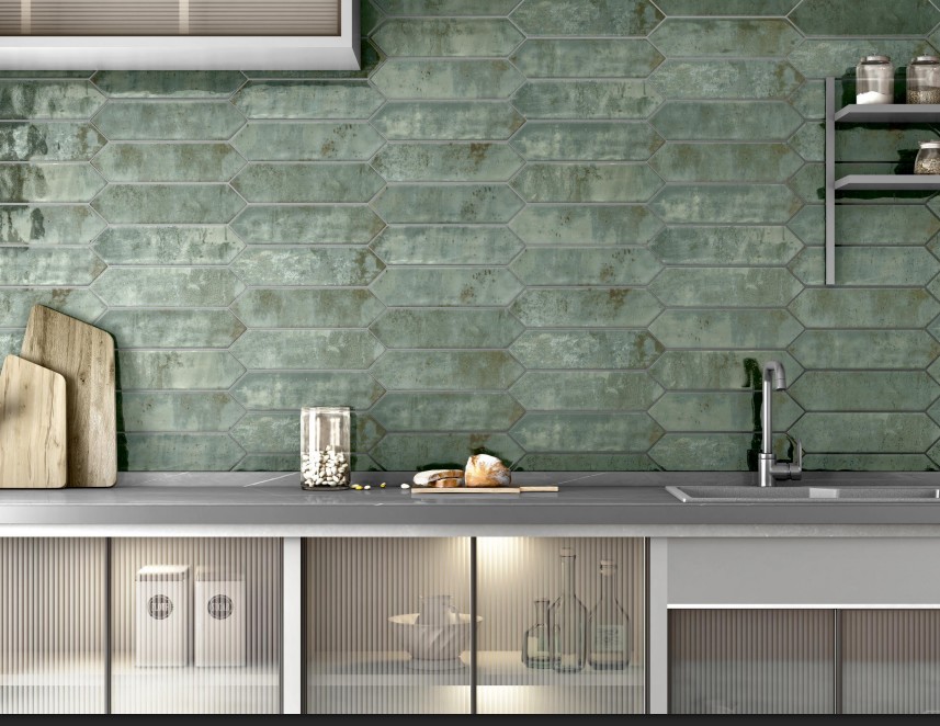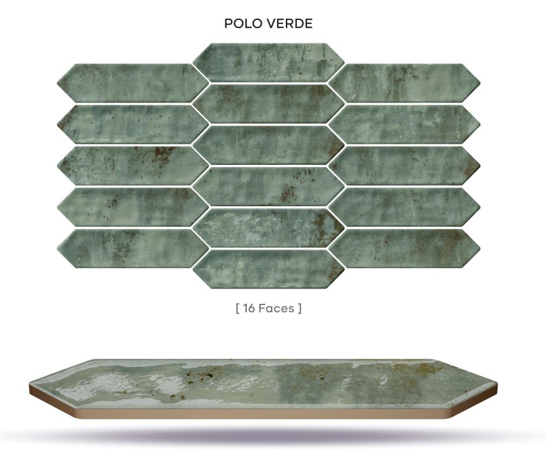 Sa forme hexagonale allongée à 16 faces crée un rythme visuel moderne et structuré, idéal pour dynamiser une crédence ou un mur décoratif. Sa teinte vert patiné, subtilement nuancée avec des effets matière inspirés du métal oxydé, apporte profondeur et authenticité à l’espace.