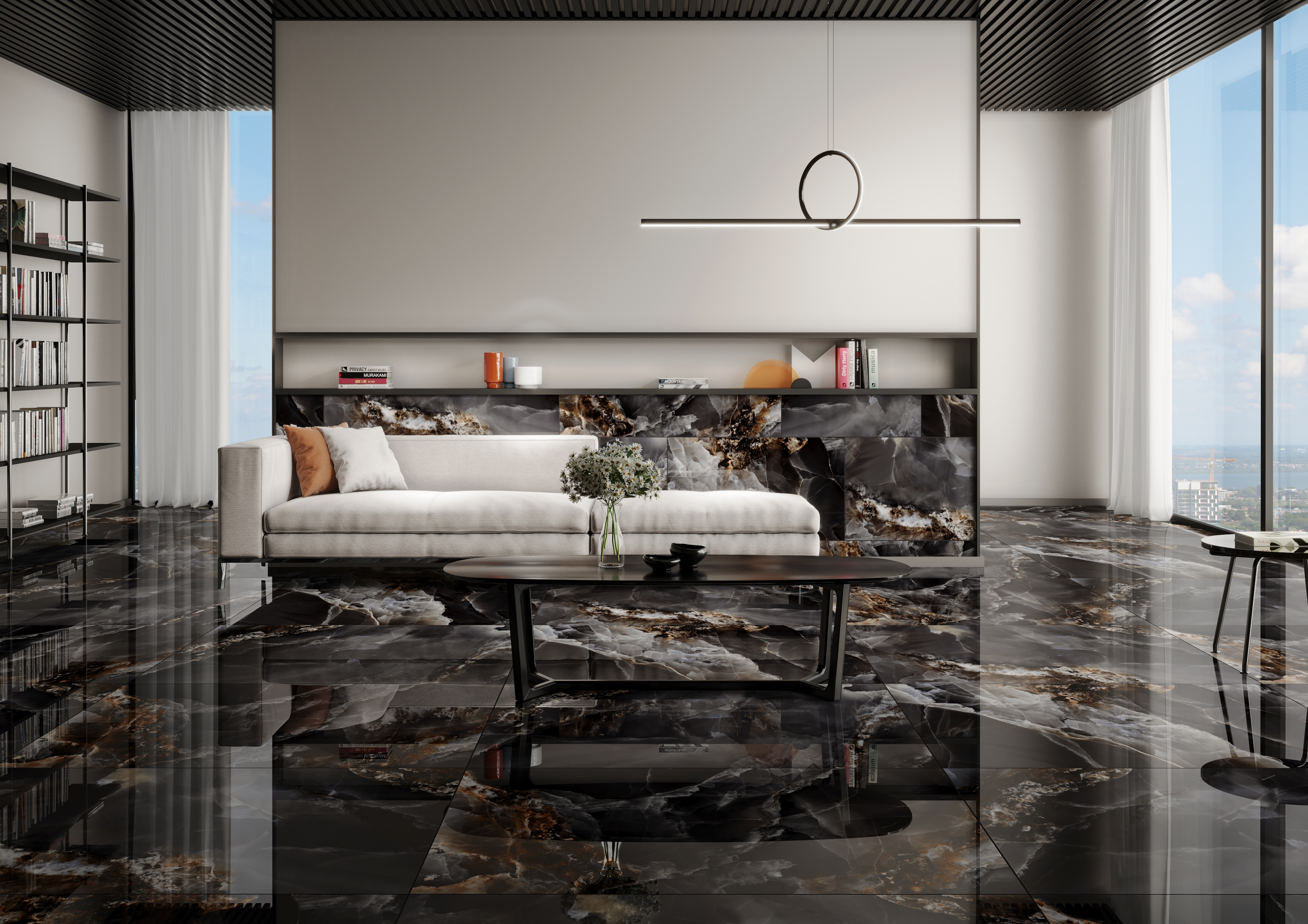 Apportez une touche de prestige et de modernité à vos espaces avec ce carrelage 60×120 cm finition brillante, inspiré de la noblesse de l’onyx noir naturel.
