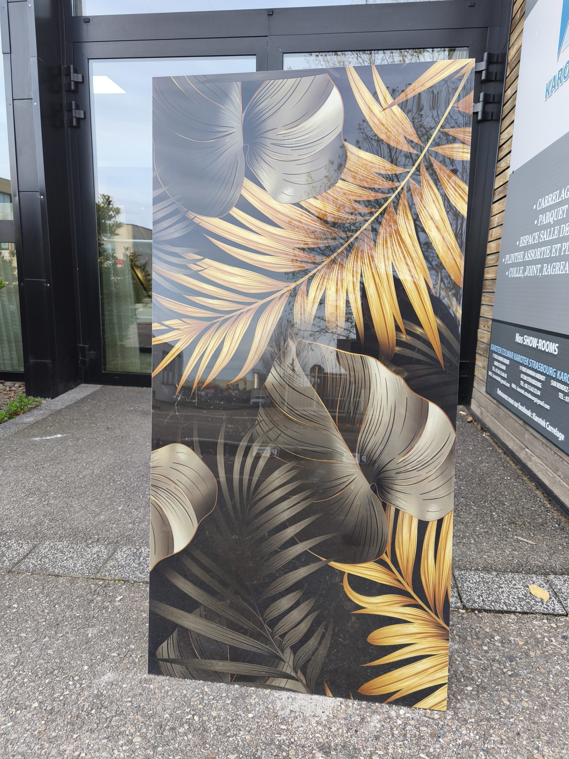 Ce carrelage est sublimé par une finition carving, qui met en relief certaines nervures et contours des feuilles. Ce relief sculpté accentue la profondeur du décor, capte la lumière et renforce l’effet précieux et tridimensionnel du motif.