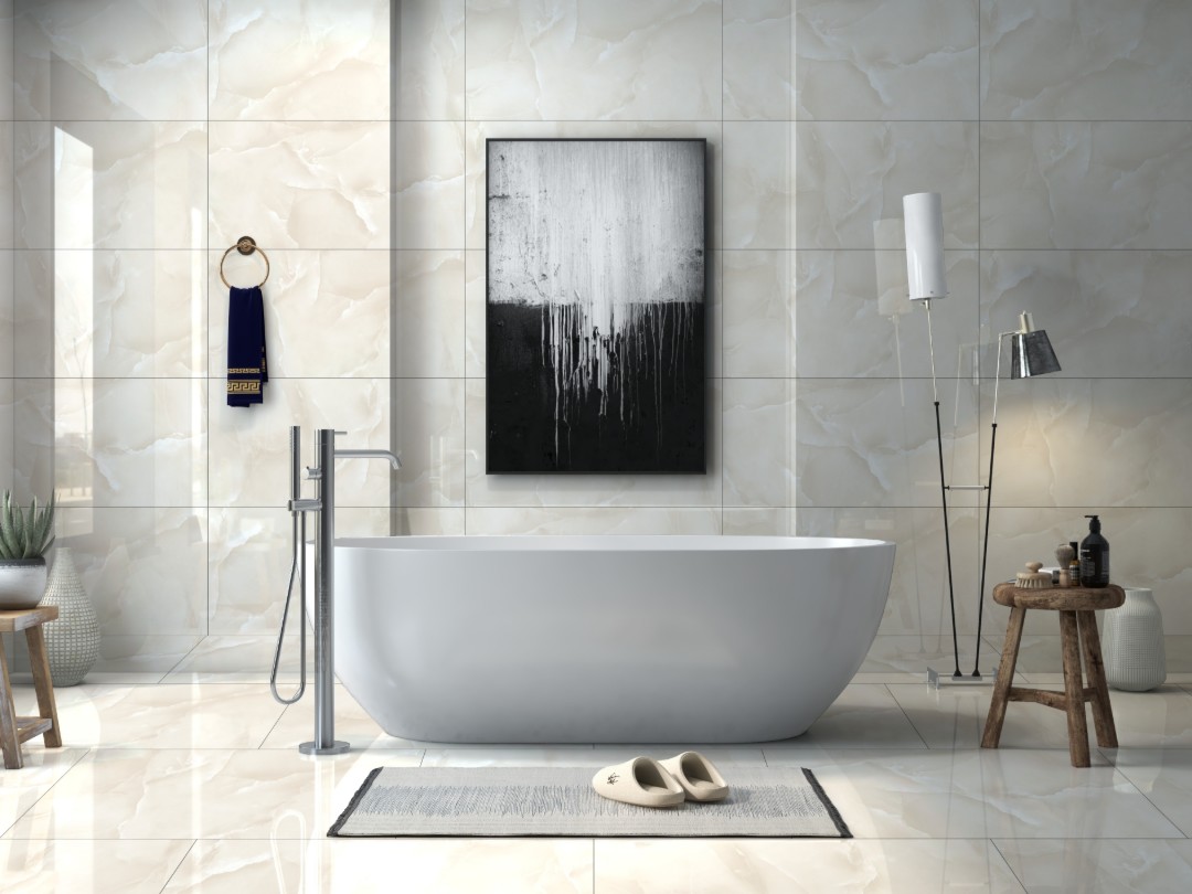 Ajoutez une touche de sophistication et de lumière à votre intérieur avec le carrelage Onyx Almond. Ce carrelage brillant au ton beige subtil, avec un effet onyx nuageux, offre un rendu naturel et raffiné. Ses nuances douces et lumineuses s’intègrent parfaitement dans tout type de décoration, créant une ambiance à la fois apaisante et élégante.