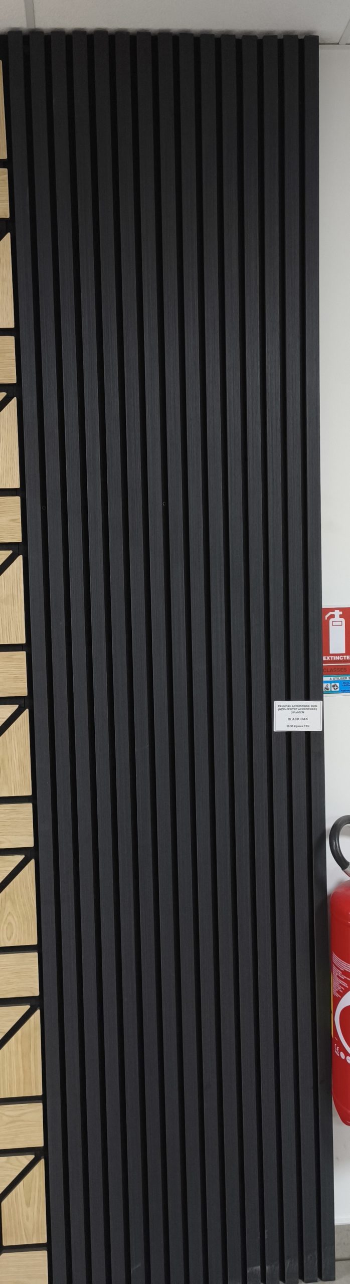 Le panneau est composé de tasseaux verticaux finition bois chêne fumé, fixés sur un support feutré noir, offrant un contraste subtil et un rendu architectural très design. Il convient aussi bien aux intérieurs résidentiels qu’aux environnements professionnels.