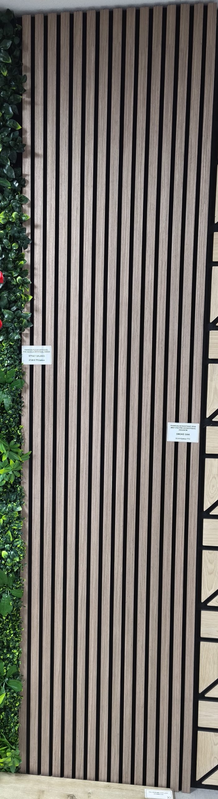 Le panneau est composé de tasseaux verticaux finition bois chêne fumé, fixés sur un support feutré noir, offrant un contraste subtil et un rendu architectural très design. Il convient aussi bien aux intérieurs résidentiels qu’aux environnements professionnels.