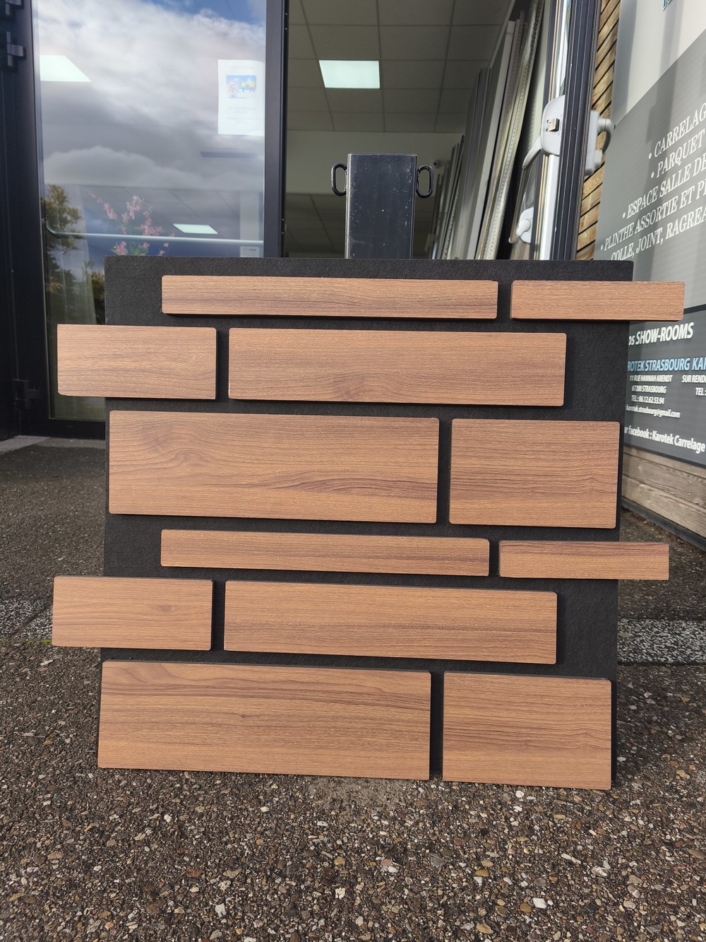 Les lames imitation bois, aux nuances naturelles et au veinage réaliste, sont disposées de manière déstructurée sur un support acoustique noir à forte capacité d’absorption. Ce contraste met en valeur le motif et renforce le caractère moderne du panneau.