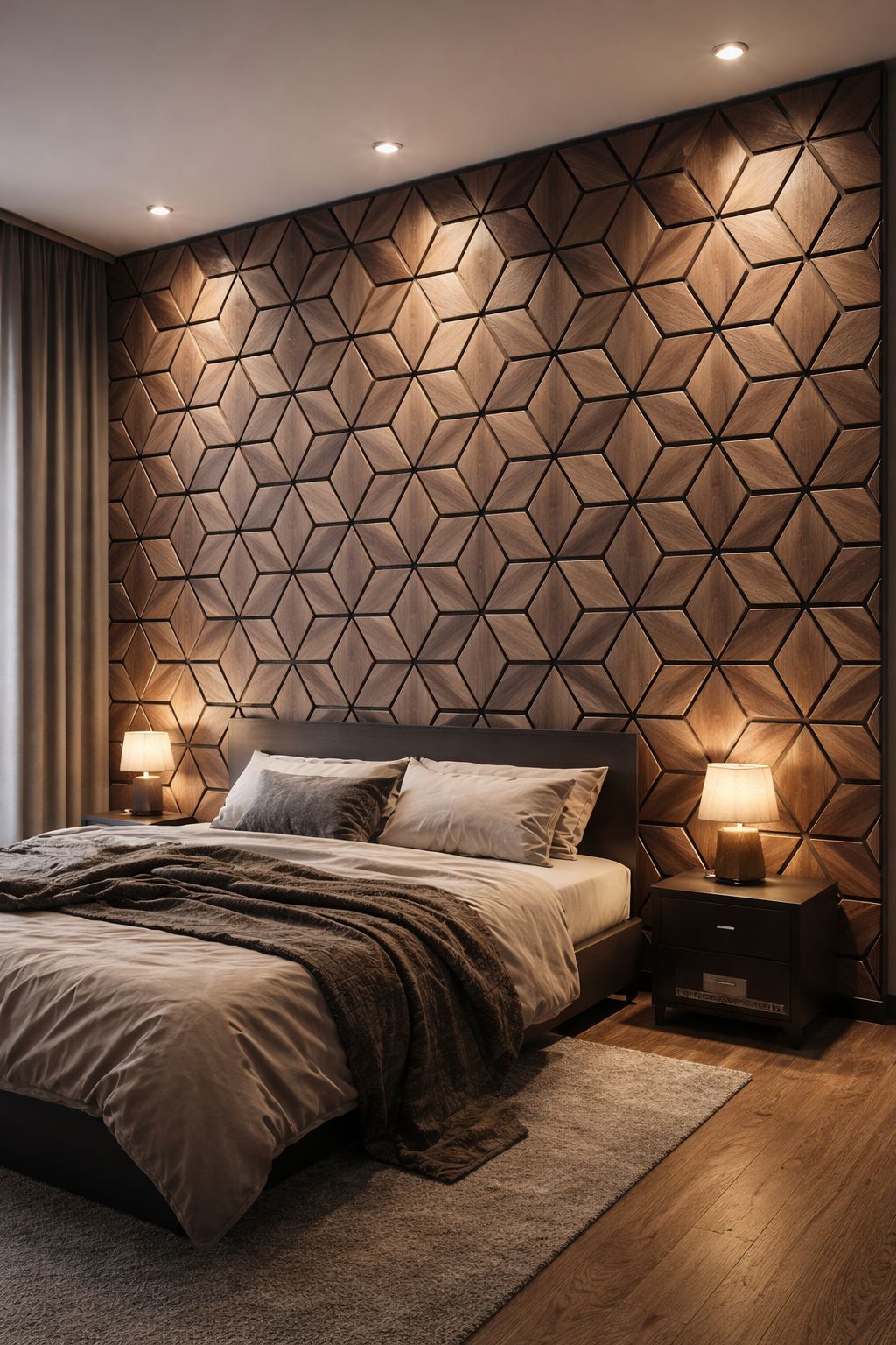 Ce panneau décoratif associe esthétique contemporaine et performance acoustique. Composé de modules géométriques en bois massif ou placage bois, disposés en motif tridimensionnel, il crée un effet visuel élégant et moderne tout en apportant du relief aux murs.
